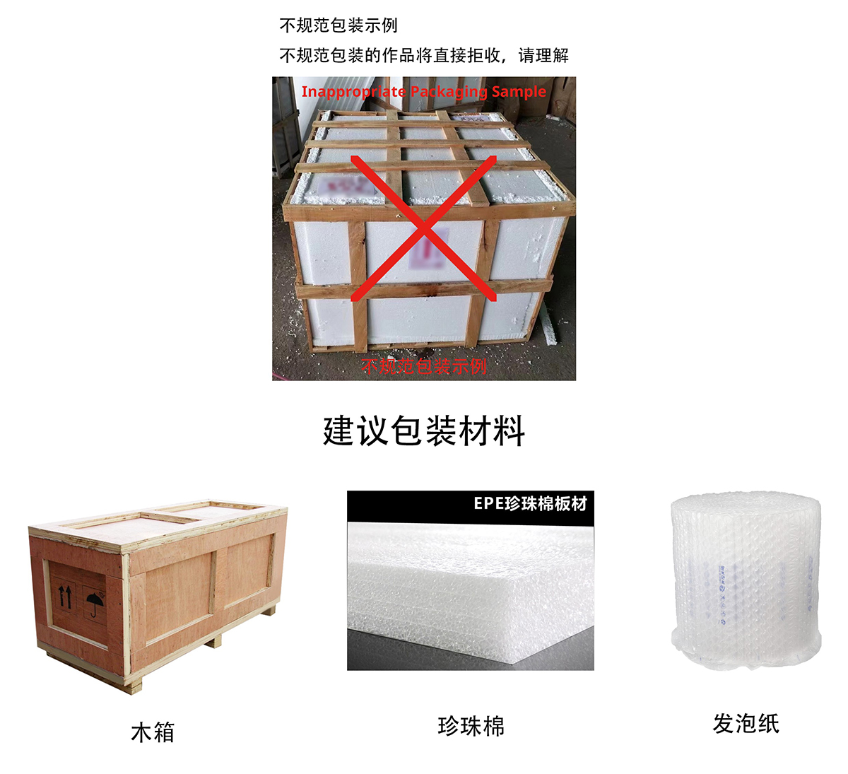 二、不能親自將作品送評的作者,請一律采用木質(zhì)包裝箱包裝作品寄送,箱內(nèi)務(wù)必放置填充物,且填充物要有一定厚度(如附圖所示),以確保運輸途中安全性。